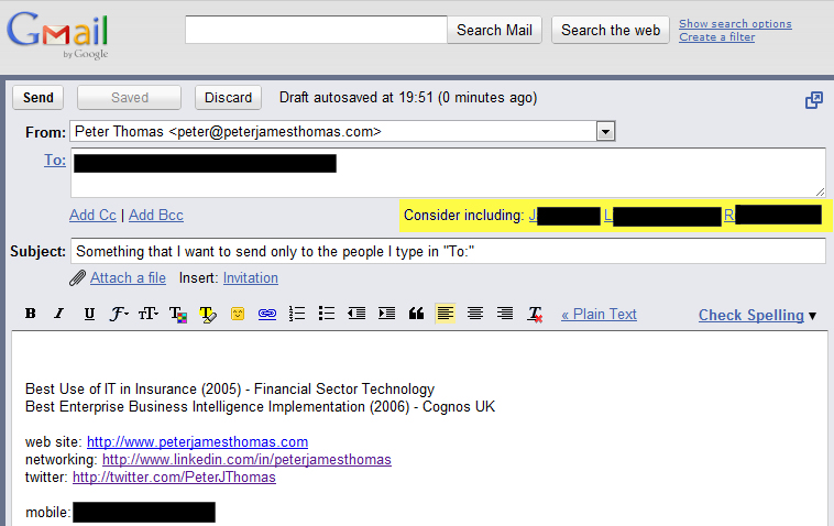 However, Google have introduced a “feature” into Gmail which leads me to question what on earth they were thinking. This is the “Consider including” function. When you type an e-mail, Gmail comes up with a list of people that you may like to also copy it to. Let’s pause and just think about this. You are writing an e-mail, generally the first thing that you do is to type in the address of the person (or people) you are writing to. Gmail has a useful feature that scans your previous mails, so typing “Pe” will bring up “Peter Thomas” as an option. So far so good. But then, based solely on this first e-mail entered (not even on the subject), the bar highlighted in pale yellow appears above with a list of people that you may consider including on the mail.